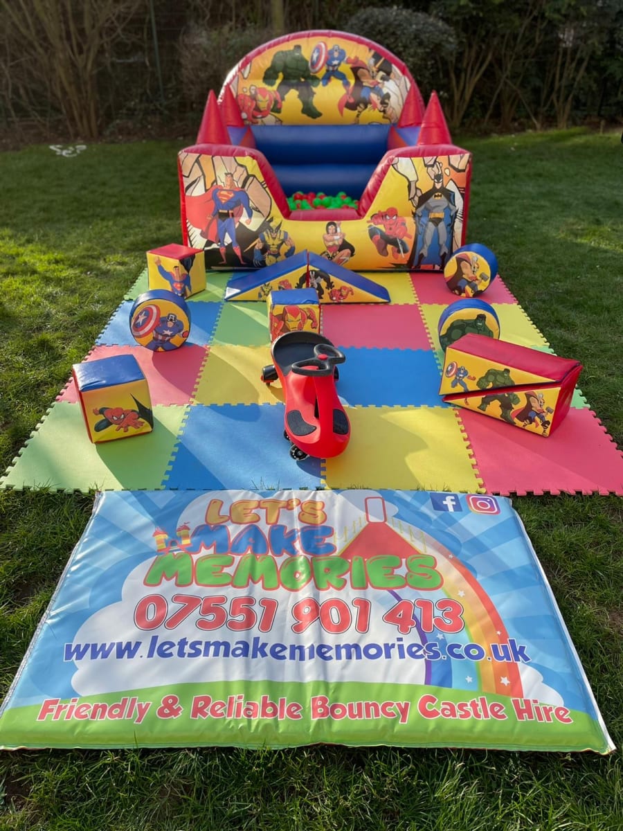 10 piece Superhero soft play set and 1 Scuttle bug.